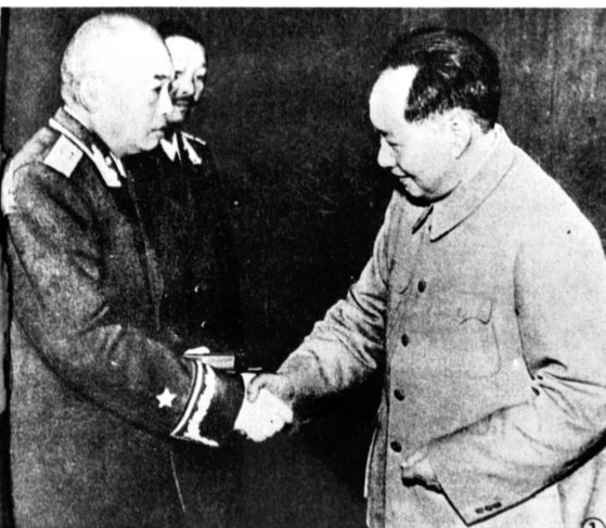 중국조선지원군사령관 펑더화이(왼쪽)가 마오쩌둥(오른쪽)으로부터 훈장을 받고 있다. [중앙포토]