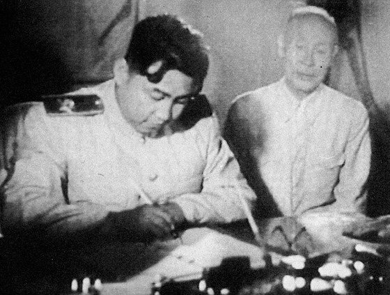 북한 김일성 주석이 1953년 7월 27일 오후 10시 휴전협정에 서명하는 모습.[연합뉴스]