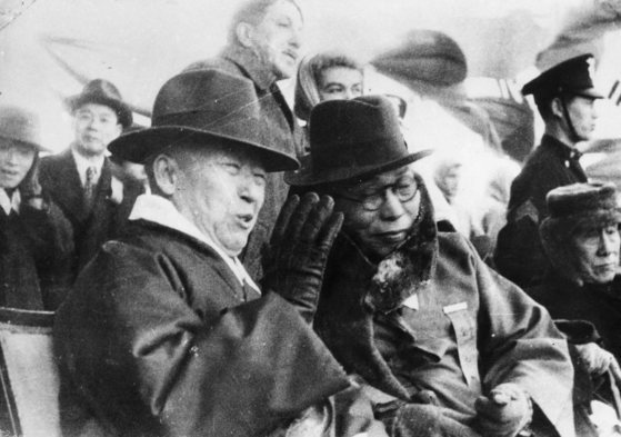 1945년 12월 서울 운동장에서의 임시정부 환국 봉영식 석상에서 이승만(왼쪽)과 김구(오른쪽)